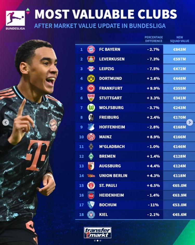 6月10日讯 德转更新了德甲球员身价,拜仁全队总身价8.43亿欧德甲最高,勒沃库森、莱比锡排在二三位。