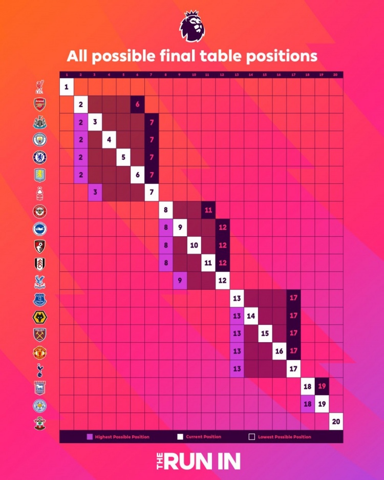 5月16日讯 本赛季英超还剩两轮比赛,英超官方列出了各队最终理论上可能的排名,阿森纳、纽卡、曼城、切尔西、维拉都有可能排名第二位。