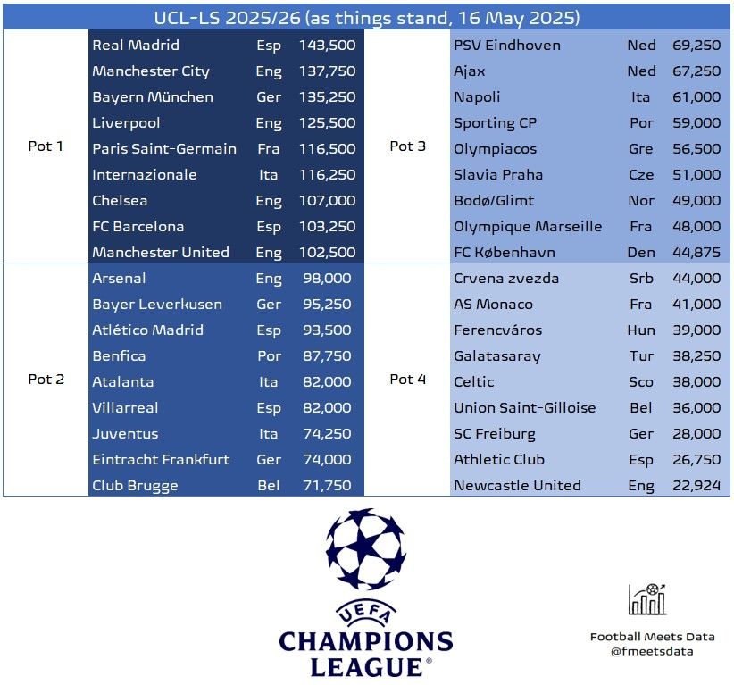 05月16日讯 今日足球数据媒体Football Meets Data更新了截止至今日,下赛季欧冠的分档情况。