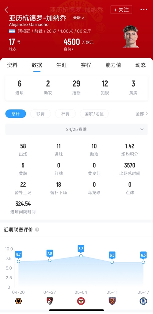 现年20岁的加纳乔现身价4500万欧,作为曼联的青训球员,他目前的年薪为260万英镑,他与俱乐部的合同持续到2028年夏天。