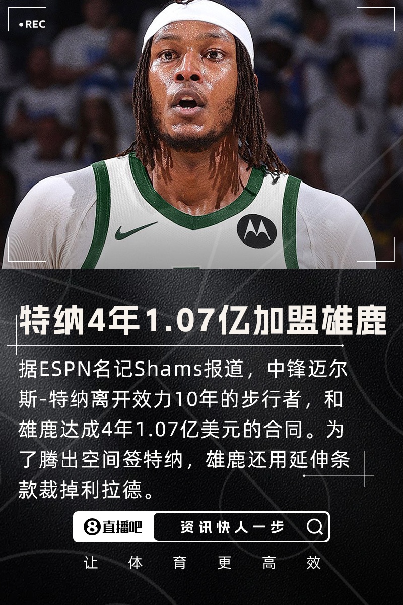 07月01日讯 据ESPN名记Shams报道,多位消息人士透露,自由球员中锋迈尔斯-特纳4年1.07亿加盟雄鹿,合同包含球员选项和15%的交易保证金。