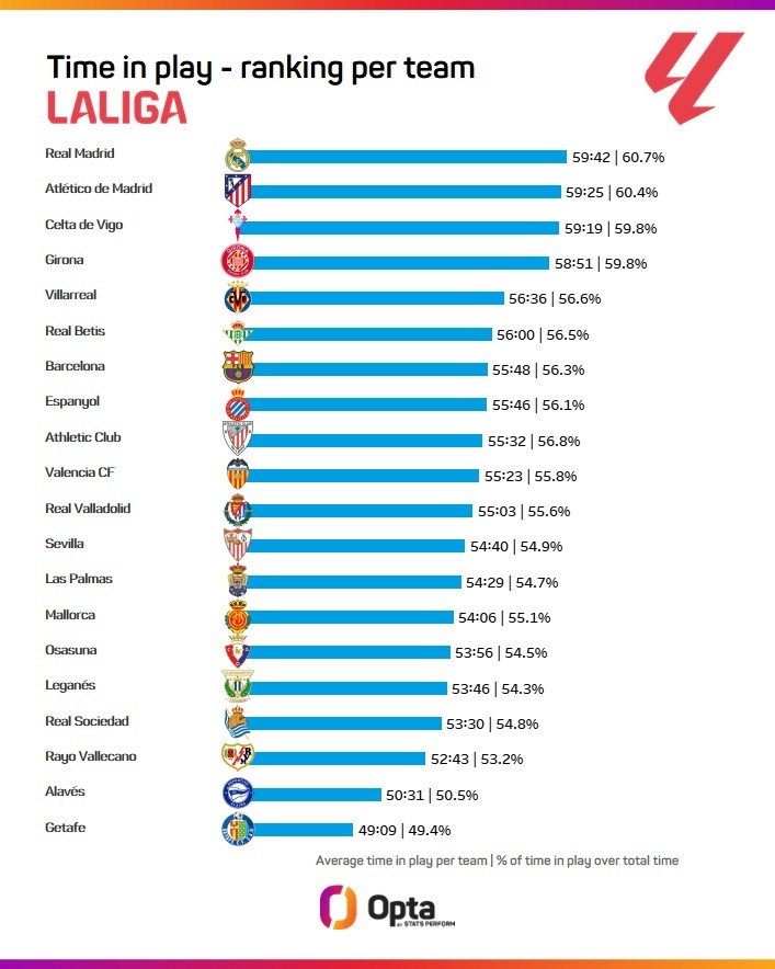 本赛季西甲场均净时间排名:皇马59分42秒最多,巴萨55分48秒第七