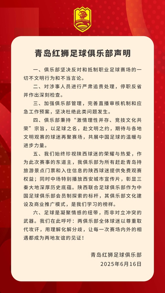 六、足球是凝聚情感的纽带,而非对立冲突的武器。我们在此呼吁:两俱乐部全体球迷以尊重取代攻讦,用理解化解分歧,让每一次赛场内外的相遇都成为两地友谊的见证!