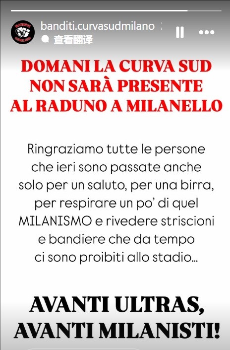 7月6日讯 米兰死忠球迷组织南看台发文,表示不会参加米兰季前训练的首日活动,以此表达对管理层的抗议。声明中写道:“明天我们不会在米兰...